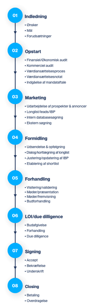 Vi identificerer relevante køberprofiler – både strategiske aktører, private investorer og branchefolk – og varetager al kontakt og dialog. Vi koordinerer hele forløbet og sørger for at du bliver inddraget på de rigtige tidspunkter – og kan føle dig tryg hele vejen.